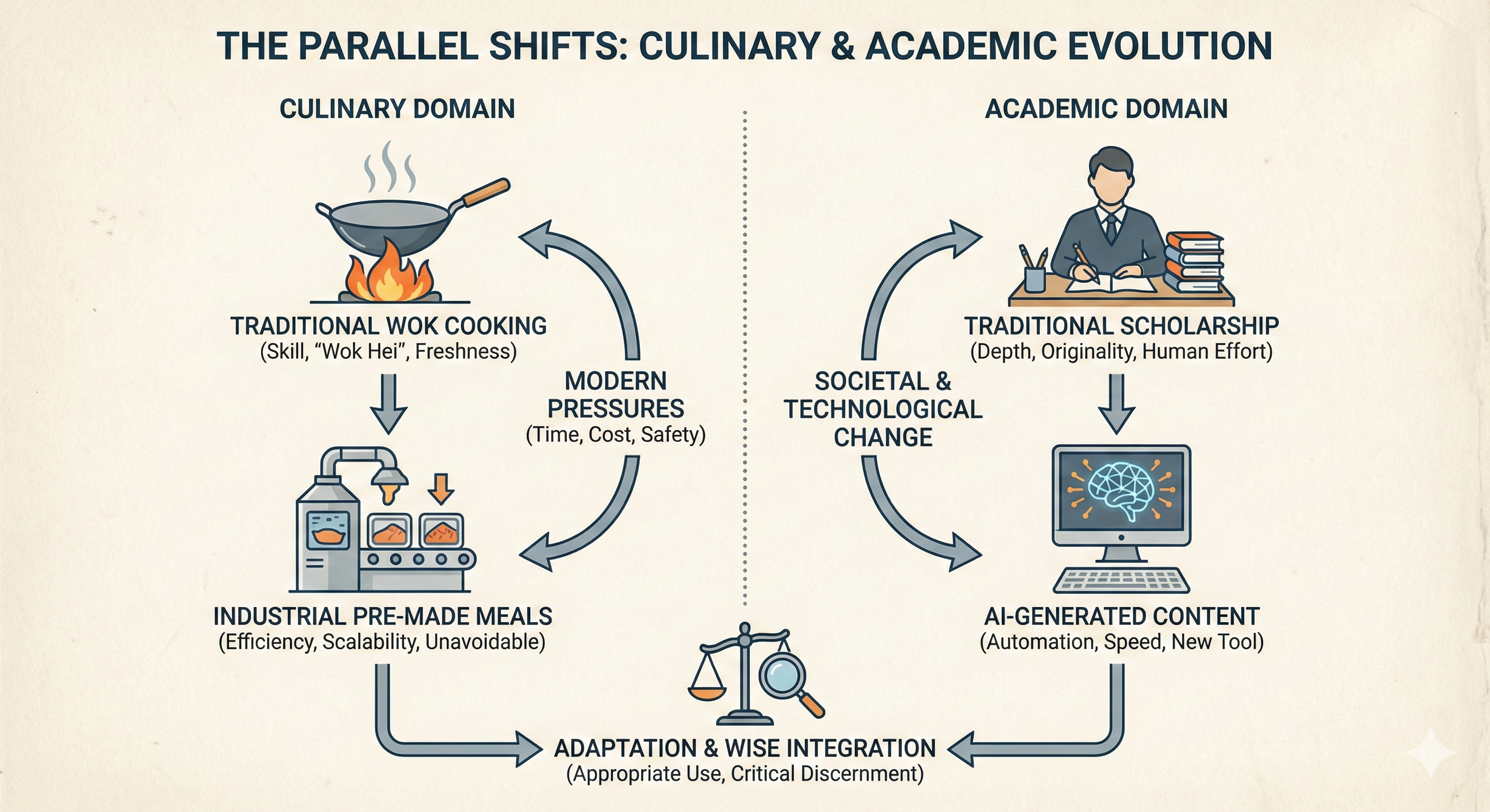 Many people resist this change. They’d rather eat at questionable street stalls than accept pre-made meals, viewing them as inferior to “real” cooking. Yet just as modern society has made pre-made meals unavoidable, AI-generated content has become unavoidable in our work. The academic community is no exception. Rather than fighting this change, I encourage us to learn how to use it wisely, knowing what’s appropriate and what’s not.